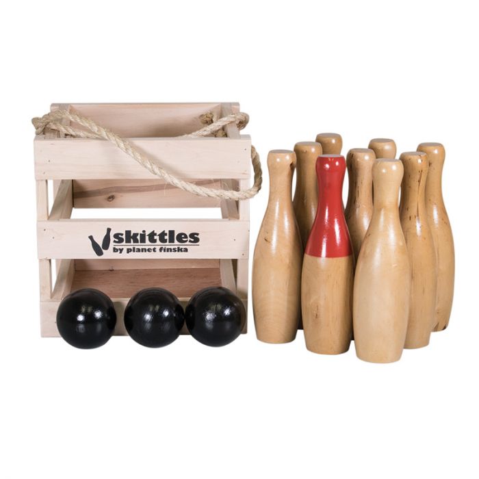 Arriving in a handy wooden crate, this nine-pin skittle set is fun for young and old. Each skittle has a height of 23cm.