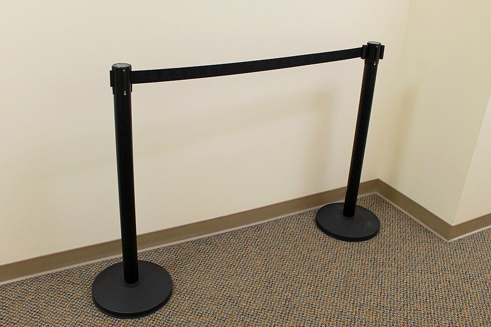 Black Queuing Barriers with Black Retractable Strap. Strap is 1.8m long.