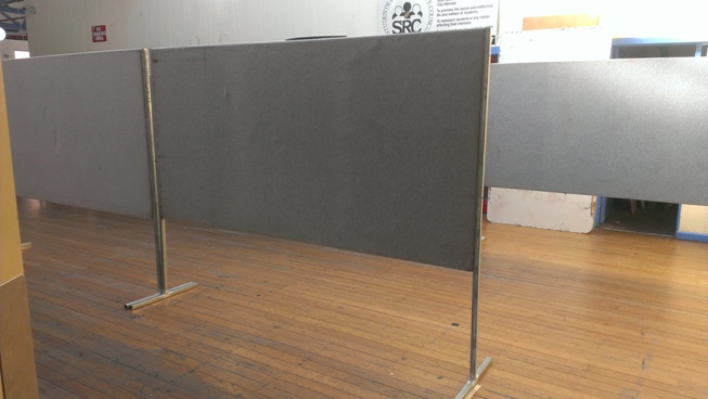 Display Board / Partitions. 1.2m x 2.4m. Can be set up in either landscape or portrait. Covered with grey carpet, can use velcro or pins to attached display items.